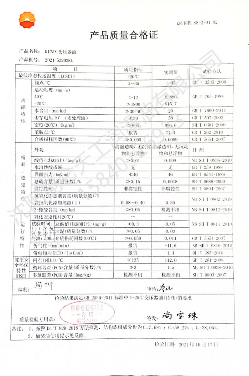 K125X/45X变压器油是由适度精制的低黏度、低倾点环